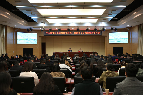 11月24日,汉中经开区召开学习贯彻党的二十届四中全会精神宣讲报告会,邀请市委党校经济学教研室主任牟小刚同志作宣讲报告。经开区党工委副书记、管委会主任王学忠主持会议。